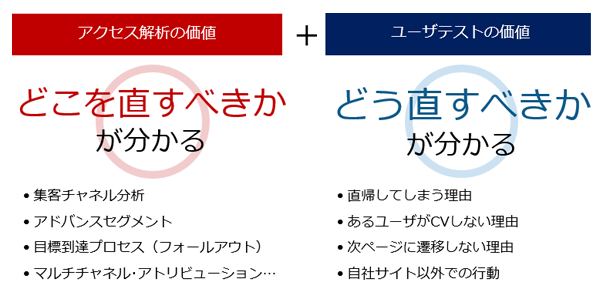 そのため、アクセス解析を使ってボリュームゾーン・直帰率などを把握した上で「どこを直すべきか」を把握し、ユーザーテストで心理データを得ることで「どう直すべきか」を把握するのが非常に有効です。