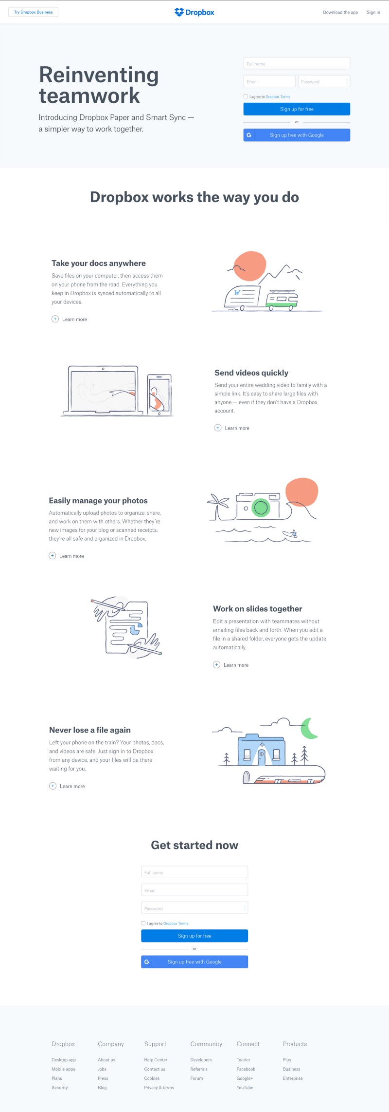 ストーリーフレームは脚本に似て、レイアウトや最終的なキャッチコピーというよりは、階層やページ構成に焦点を当てています。DropboxのWebサイトをストーリーフレームのフォーマットに当てはめるとどうなるか見てみましょう。
