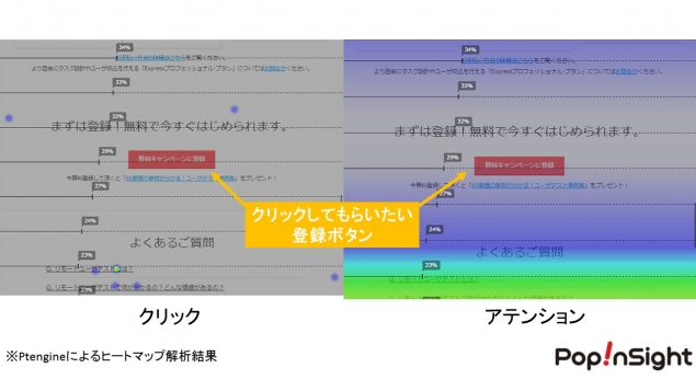 上の図は弊社のユーザテストExpressのサイトをPtengineというヒートマップツールで解析した結果です。ページ後半に位置する登録ボタンは、クリックも注目(アテンション)もされていません。本当はクリックしてもらいたいにも関わらず、残念ながら現状ではあまり効果がないことがわかりました。
