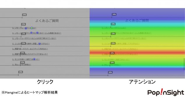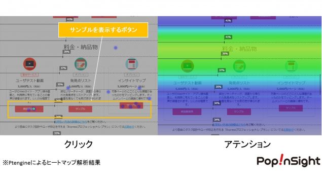 上の図は、ユーザテストExpressのサイトをPtengineでヒートマップ解析したものですが、アテンションから「料金・納品物」の項目に注意が向けられていることがわかります。左側のヒートマップでは動画例やサンプルを表示するボタンのクリック頻度が高いことがわかります。