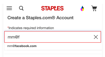 入力時のタイピングを削減する別の方法は、Eメールのフィールドに一般的なドメイン名の一覧を提供することです。Staplesはソリューションとして事前入力を使用しています。ユーザーがタイピング中に@を打ったときに表示され、1回の入力に対し最大12回のタイピングを省略します。