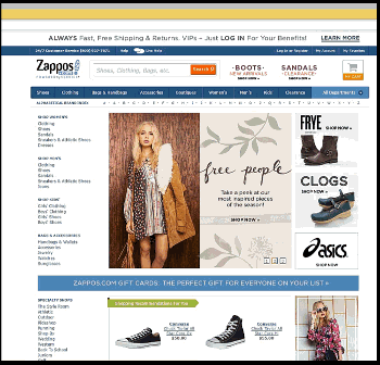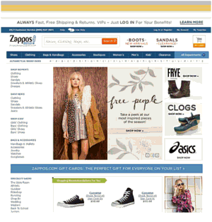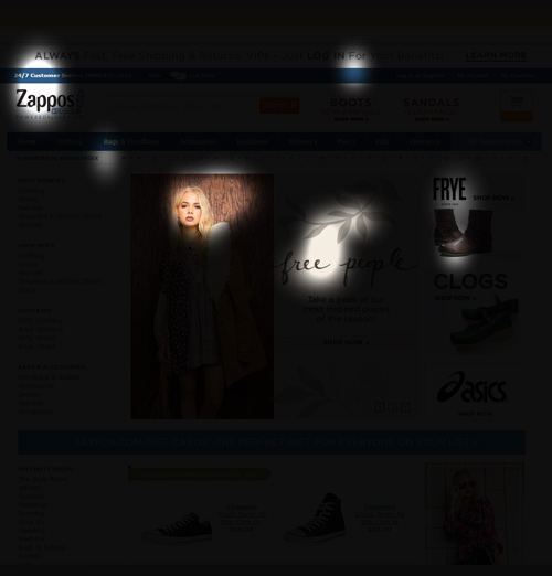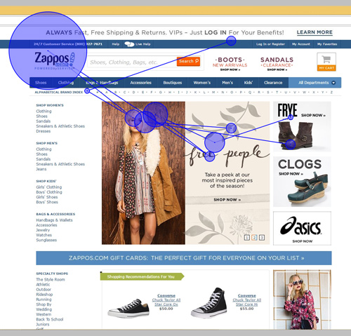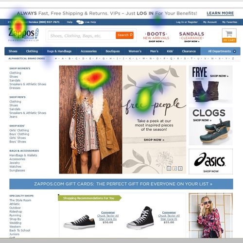 調査中のある被験者(またはすべての被験者)がどこを見ているのかを示すものをヒートマップといいます。 ヒートマップは、温度がない天気図と似ていますが、気温の代わりに注視点がプロットされています。 注視点とは、100〜500ミリ秒(10分の1秒から0.5秒)間に見られている場所です。注視点が集中すればするほど、色がより赤くなります。 図1aのヒートマップは、Zapposのホームページを見たある被験者のもので、1bは13人の被験者のものです。
