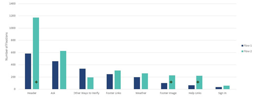 AOI内の注視点の数も、仮説を検証するための別の指標となります。 似たような結果となった図7では、2番目のデザインのヘッダー、フッター、およびヘルプリンクが最初のデザインよりも注視された回数が多いということがわかりました。 注視点の数は、滞留時間と似たような結果をもたらしますが、常に同じではありません。