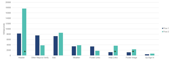 被験者がAOI内で注視したり、ただぼんやりと見ているだけの時間は、滞留時間と呼ばれます。 AOI、またはデザインの滞留時間を比較することができます。 たとえば図6は、8つのAOIごとでの、2つのデザインの平均滞留時間を示しています。 被験者は、最初のデザインよりも2番目のデザインのヘッダー、ヘルプエリア、フッターに多くの時間を費やしていました。 このデータはほかのタスク観察を組み合わせることで、さまざまなユーザー体験をより理解するのに役立ちました。