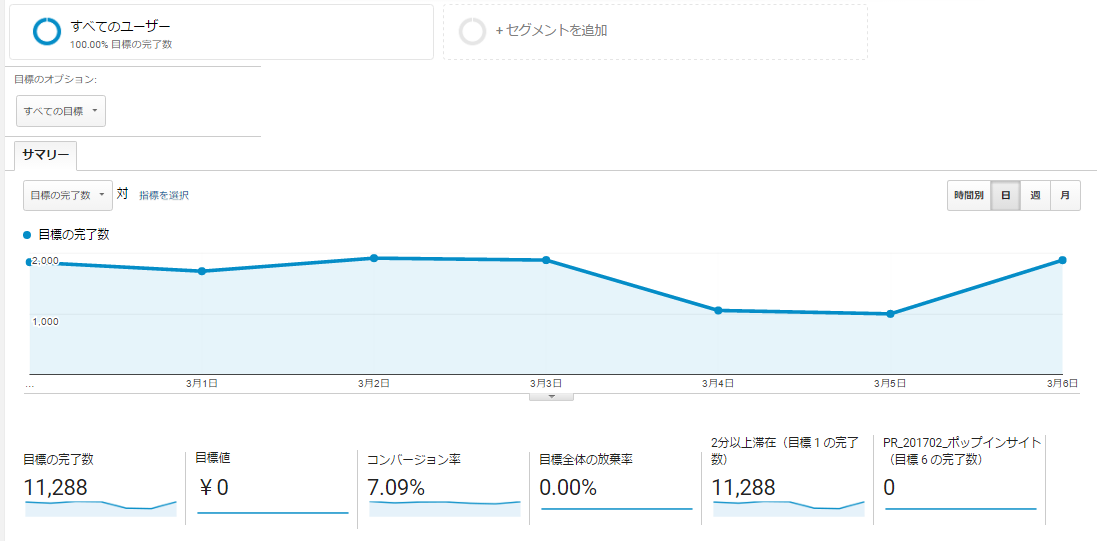 サマリーをみると、グラフの下に目標の完了数やコンバージョン率などが表示されています。サマリーで注目すべき項目は、右側に表示されている設定した各目標の完了数です。