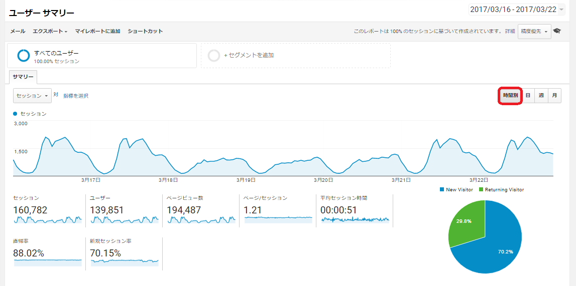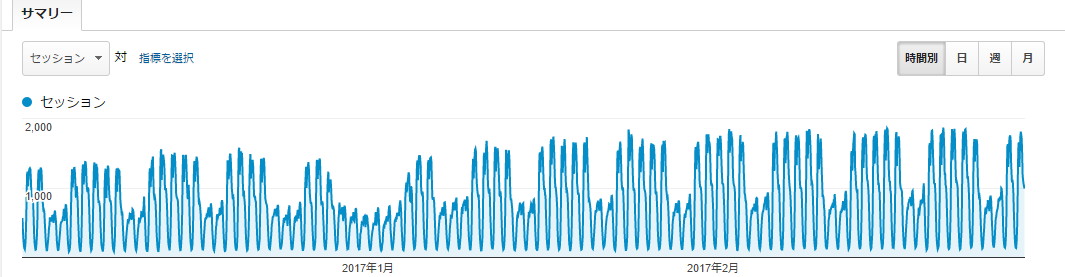 サマリーを開いたあと、グラフの右上にある「時間別」をクリックすると、時間別のセッション数を調べることができます。