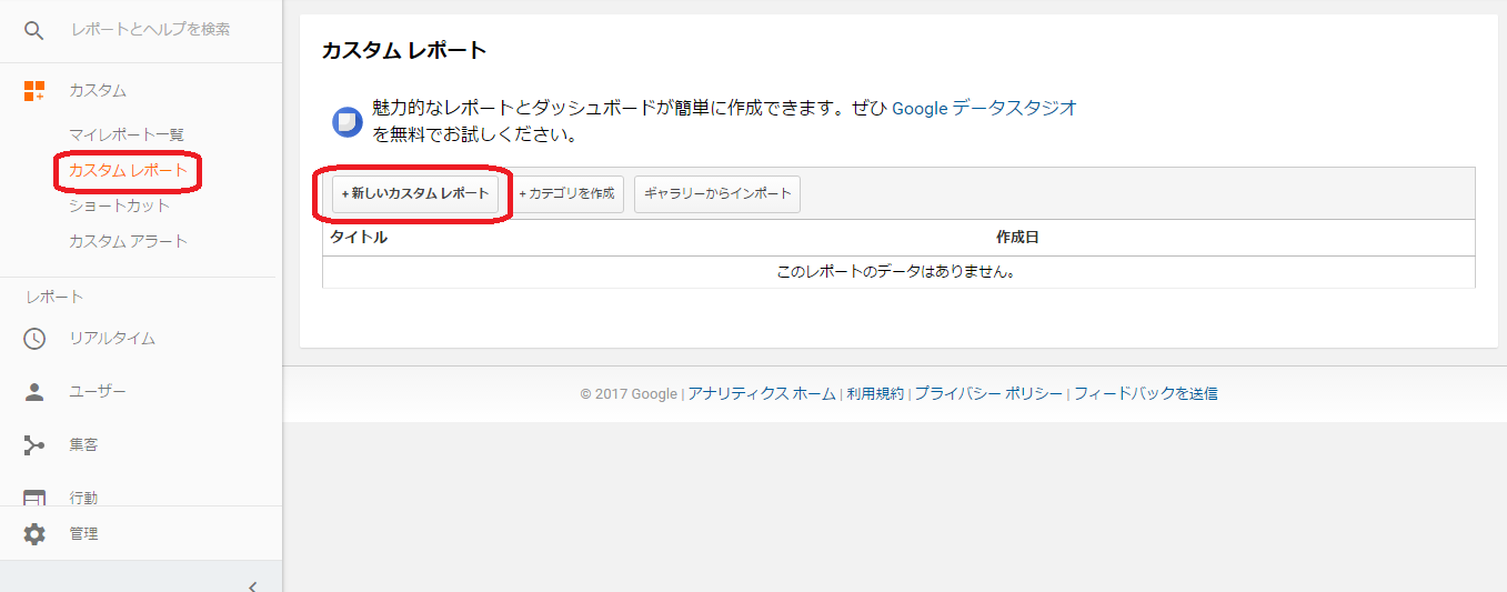Google Analyticsのメニューから、カスタム>カスタムレポートの順にページを開きます。