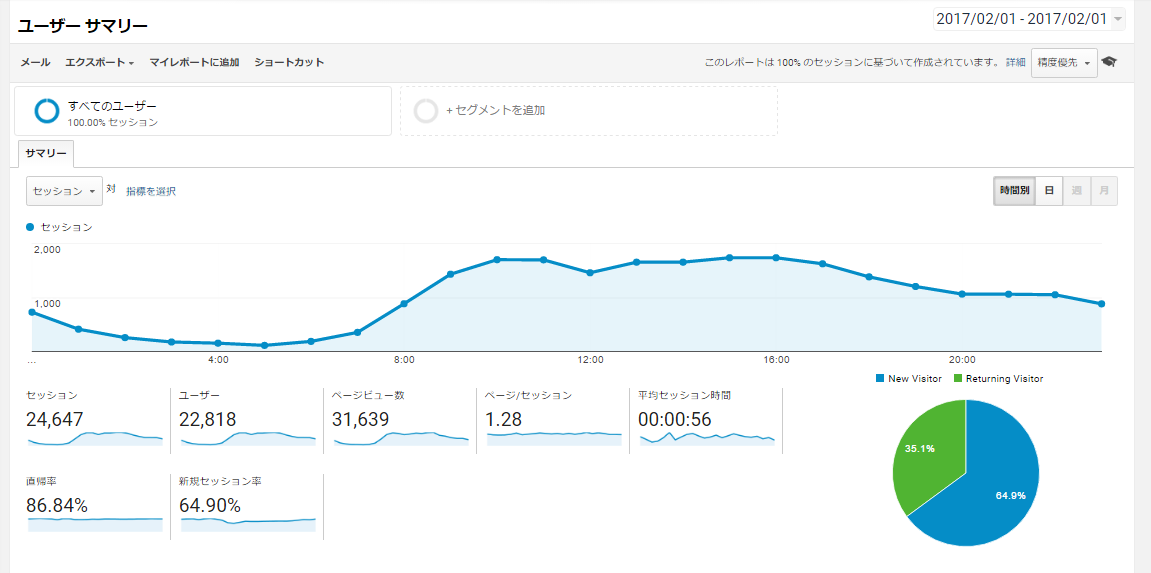 たとえばこのサイトでは、16時、15時、11時の順でアクセスが多く、19時以降から8時にかけてはセッション数が少ないということがわかりました。