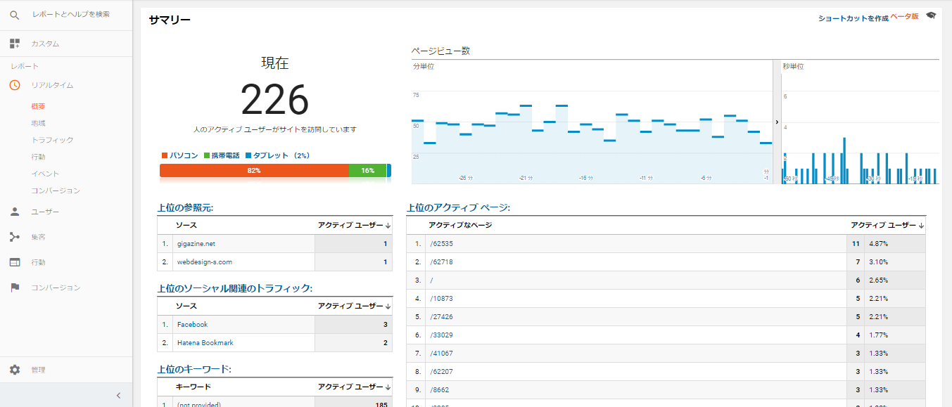 このサマリーでは、リアルタイムでのサイト分析結果を表示しており、一番最初に表示されるサマリーでは訪問ユーザー数、ユーザーの使用しているデバイス、PV数などのリアルタイムデータが一目でわかります。