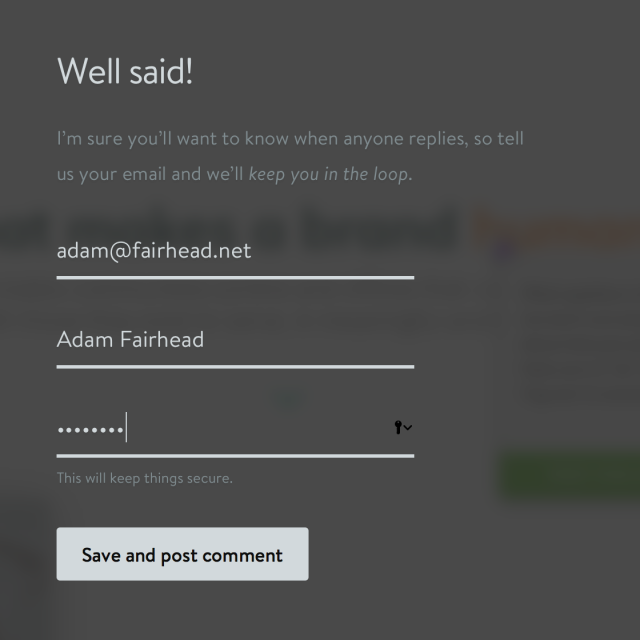 画像にいくつか文章を載せると、ダイアログが出現して以下のようなメッセージが表示されます。「素敵な投稿ですね。誰かがリプライを投稿したらお知らせしたいので、メールアドレスを教えてください。あなたも仲間に入りましょう。」