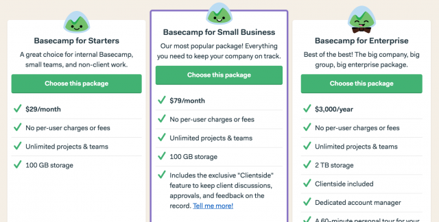 Basecampのページは、サービスの終わりを見せないサイトの良い例です。Basecampのサイトには「それはできません」と言われる瞬間がありません。多くのSaaSタイプのプロダクトと違い、アップグレードは頻繁に利用するユーザーがプロダクトを使い続けるために許可されるものではなく、それまでアクセスできなかった新しい機能を解除するものを意味しています。
