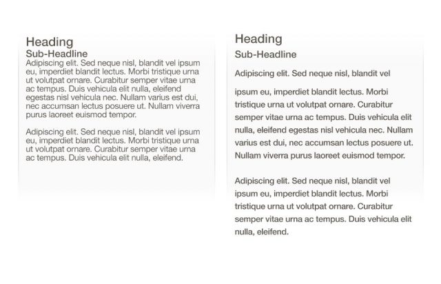 タイポグラフィにおいて、行と行の間のスペースを表す特別な言葉があります。レディング(または行送り)です。行送りを増やすと、行の間に空白を増やすことになり、一般的に画面サイズの問題と引き換えに読みやすくなります。原則として、行送りが文字の高さの30%以上あると読みやすくなります。
