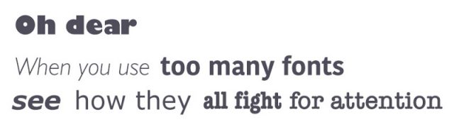 3つ以上異なるフォントを使うと、Webサイトが体系化されていない、専門的でない印象になってしまいます。また、一度にサイズやスタイルを変えすぎても、レイアウトを壊してしまうことを覚えておいてください。