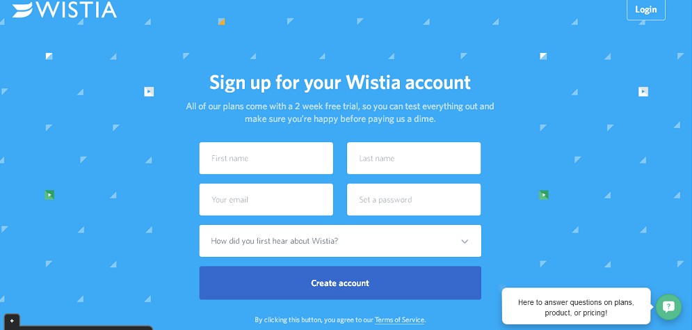 「アカウントを作成(Create account)」は完全にカプセル化されていて、背景とのコントラストがはっきりとしています。画面には余計な選択肢がありませんし、多くのスペースが空白と「フォームに記入してください」というわかりやすい道順に使われています。また、「私たちのすべてのプランには2週間の無料トライアルが付いています。少しでもお金を払う前に、サービスに満足できるかどうか確かめてください。」という文言とともに、購入前のお試しオプションが提供されています。