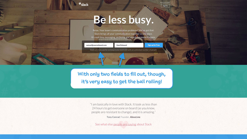 製品やサービスをより複雑にしているものは何ですか? Slackのようなアプリのオンボーディングはどうでしょうか? Slackを使うためには、アカウントが必要です。そのため、オンボーディングはホームページから始まります。