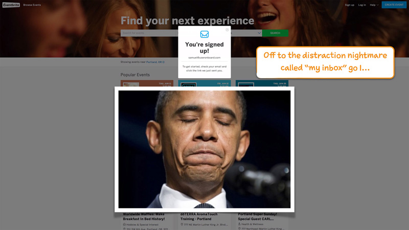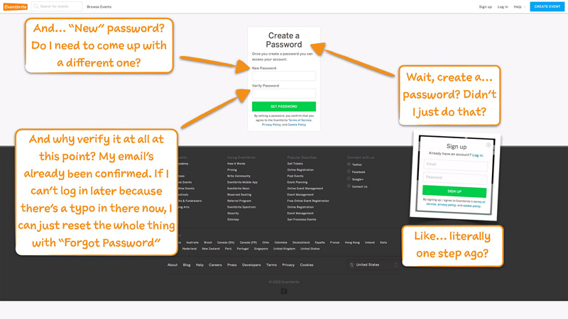 別の例として、Eventbriteのアカウント作成を見てみましょう。まず、メールアドレスとパスワードを入力してアカウントを作成します。そして、あとからメール経由で認証を求められます。メールのリンクをクリックしてアカウントを有効にすると、新しくパスワードを作成するページに移動します。