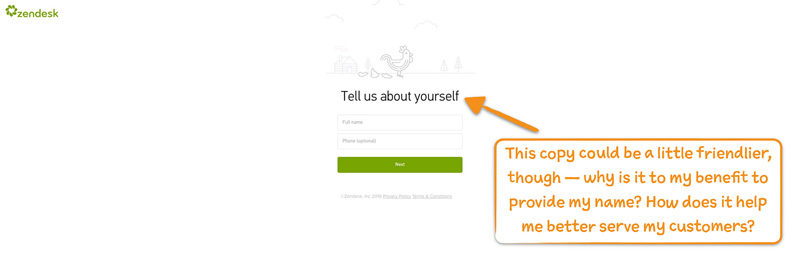 下のスクリーンショットでは、Zendeskはあまり質問していないように見えるかもしれません。結局のところ、ユーザーの名前とオプションで電話番号のみを尋ねているのです。それでも私がユーザーなら、なぜいずれかの情報を提供するべきなのか、理由がわかりません。