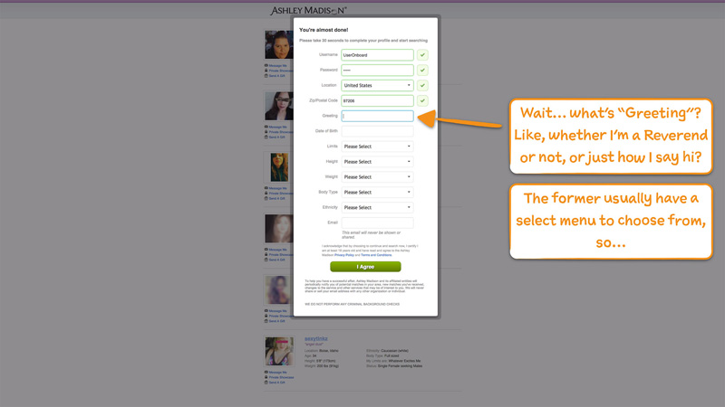 ここにマッチングサービスのAshley Madisonの例があります。より良いマッチングをするために、いくつか情報入力をしなくてはなりません 。そこまでは理解できますが、下のスクリーンショットを見ても、フィールドのいくつかは単に入力する意味がわかりません。Greetingとは何を入力すればよいのでしょうか? どういう風に挨拶するかなどでしょうか。せめてプルダウンにしてほしいものです。
