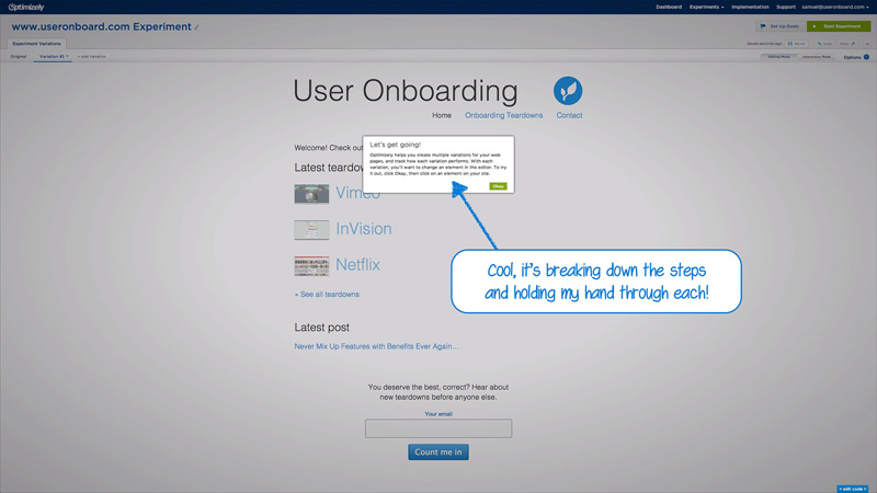 Optimizelyのような複雑なアプリがウォークスルーを使うことで、新規ユーザーにとって易しいイントロになるため、製品の扱い方を完璧に理解してもらうことができます。ほかの項目と同様に、ウォークスルーは十分に考慮するようにしてください。