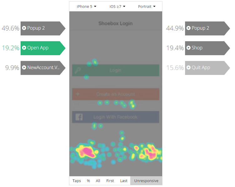 しかし、AppleのiPhoneの利用が拡大し、iPadもますます増加しているため、画面サイズの最適化は主要なモバイルオペレーティングシステム全体においても同様に重要になっています。開発者はタッチヒートマップにより、アプリの各要素が画面外に表示されていないか、特定の画像サイズにおいてアプリのデザインが乱れていないかがわかります。