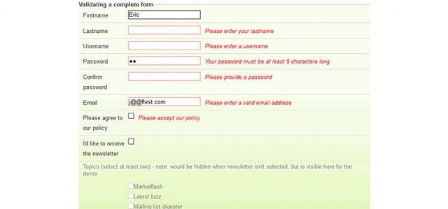 jQuery Validation Pluginはフォームデータの検証に役立つ、ハイレベルなカスタマイズが可能なツールです。URLとメールアドレス両方のバリデーションを、入力フォームの枠外でサポートします。開発者が独自の仕様を追加できるようにするAPIもあります。