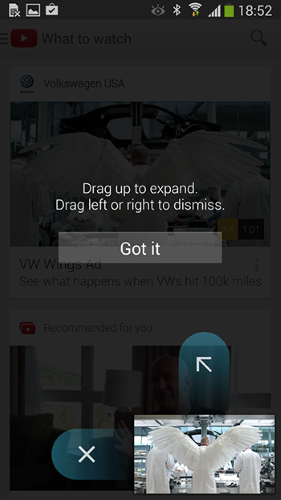 コンテキストに沿ったヒントは、Android向けのYouTubeアプリで見受けられます。アプリは、ユーザーの注意を1つの主要アクションに集中させることで、指示の量を最小限にしているのです。ここでは、馴染みのないインタラクションを説明するオーバーレイを使用しています。これらのヒントは、1つずつ表示されるので、新規ユーザーは関連するセクションにたどり着くことができるのです。