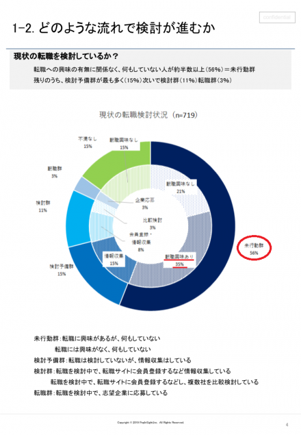具体的な行動を起こしている「行動群」は29%、転職への興味の有無に関係なく、何も行動を起こしていない「未行動群」は56%でした。