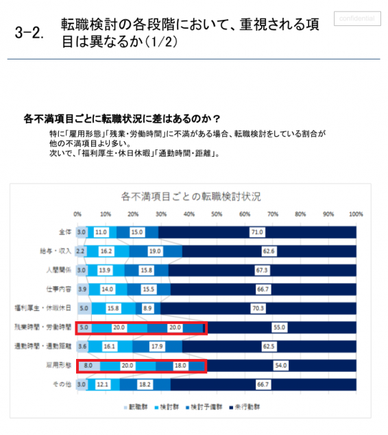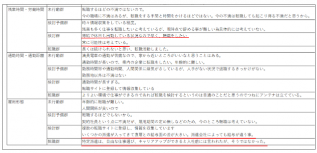 ユーザアンケートの結果、実際に転職への行動を起こしている「行動群」には、「残業・労働時間」と「雇用形態」(正社員か契約社員かなど)とに不満を感じている人が多い傾向があることがわかりました。