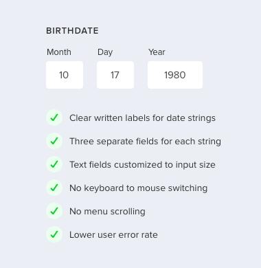 デスクトップユーザーがキーボードからマウスへ持ち変える必要がないため、テキストフィールドの生年月日入力フォームは、選択式やカレンダーウィジェットのものよりも使いやすくなっています。モバイルユーザーにとっても、小さな選択肢をスワイプやタップする必要ががありません。