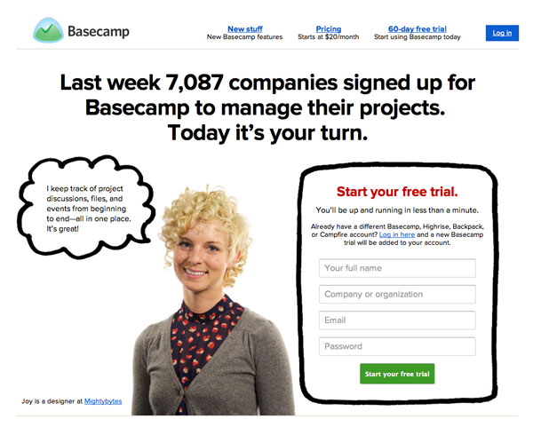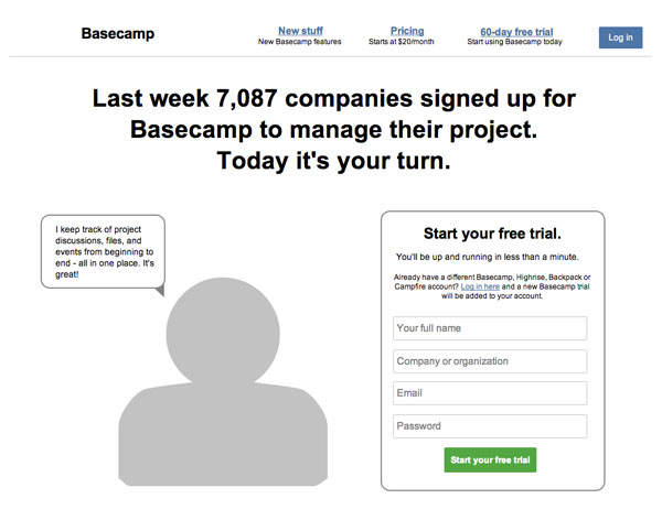Basecampでは、彼らの実際の顧客を写真と「先週7,087の企業がBasecampに登録しプロジェクトを運営しています。今日は貴社の番です。」というコピーを表示することで社会的証明をうまく活用しています。これは強力な解決策です。