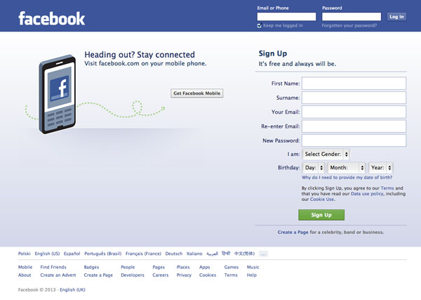 Facebookの登録フォームのラベルをよく見てみましょう。「新しいパスワード」というラベルがありますでしょう。これは安全性に配慮した良い例です。他サービスで頻繁に使用しているパスワードを使わずに新しいパスワードを作るように顧客に促しているのです。賢いデザインです。