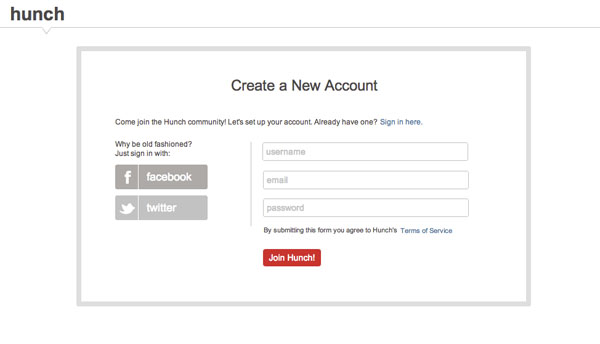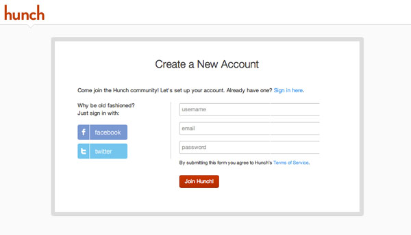 Hunchのフォームを見てみましょう。無駄な時間と労力を省くために、FacebookやTwitterアカウントでサインインするように促しています。“Why be old-fashioned?”(その方法、古臭くない?)という直接的でくだけた表現が親しみやすさを演出しています。