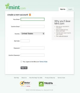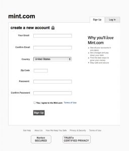 Mintは視覚的表現(施錠アイコン)を使い登録の全過程が安全だということを暗示します。NortonとTRUSTeのシールがさらにフォームの安全性を保証しています。