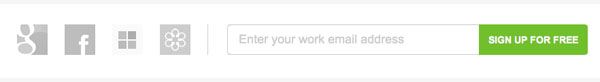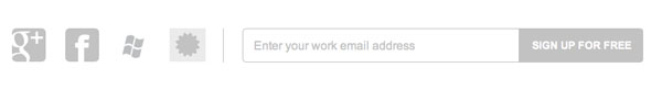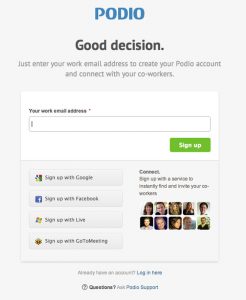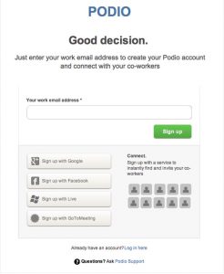 Podioのフォームフィールドは、たったの1つです。しかしSNSサインインのオプションはよりわかりやすくなっています。一般的なFacebookやTwitterでの登録以外にも、GoToMeetingでのサインインなど仕事目的での利用を考える顧客にも対応しています。