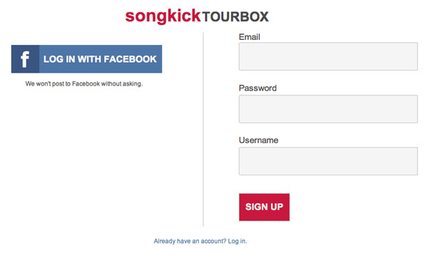 登録フォームへの安心感を高める興味深い例として、Songkickの登録フォームも挙げられます。Songkickは、定番の登録フォームと共にSNSへのサインインも採用したよくある形式を使用しています。