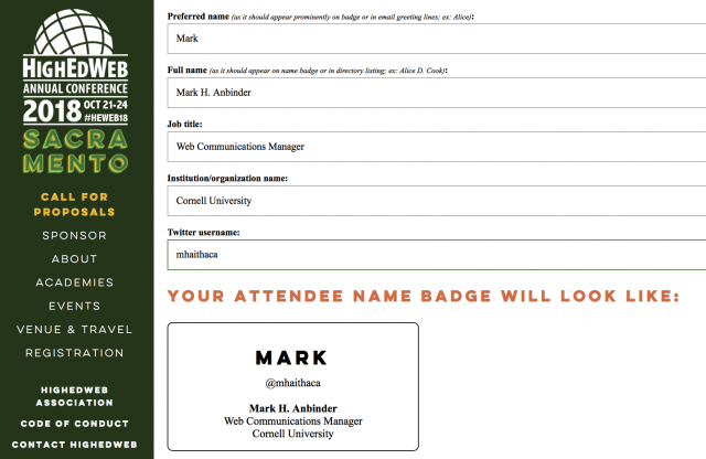 HighEdWeb会議は、フォームで名前を尋ねる際に優れたソリューションを提供しています。フルネームとともに、挨拶で使用したい名前も訪ねているのです。加えてこのフォームでは、挨拶で使いたい名前の付け方とその理由を明確にするために、挨拶は「Alice」フルネームは 「eg Alice D. Cook」といった例を挙げて文脈に合わせた記入例を提供しています。