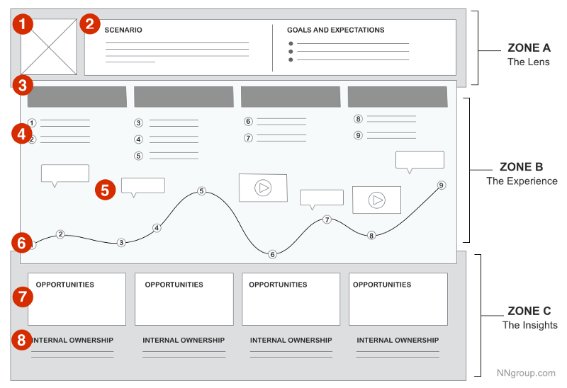 ユーザージャーニーマップはさまざまな形やフォーマットで表されますが、一般的にはユーザーとプロダクトの間のすべてのタッチポイントのタイムラインが表示されます。ここにはユーザーがプロダクトとインタラクションするために必要なすべてのチャネルに関する情報が含まれています。