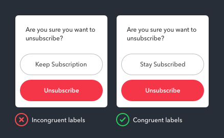 これは「サブスクリプションを継続する」も最良の選択ではない理由にもなります。両方のボタンラベルに同じ単語が使用されていると、ユーザーは片方のボタンをもう片方のボタンと間違える可能性があります。同じようなラベルはユーザーが注意深く読むことを要求しますが、彼らはいつもそうしません。
