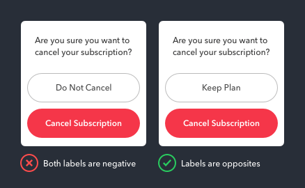 それだけでなく、「キャンセルしない」が「キャンセル」の反対ではないということは、同じ否定的な意味を共有しているからです。両方のラベルに否定的な意味合いがあると、ユーザーはそれらを破壊的なアクションとして読み、混乱します。