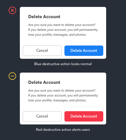 破壊的アクションが確認画面に表示された際には、ユーザーの注意を最大限に引く必要があります。逆に、それが確認画面でない場合は、注意を向けさせないほうが良いのです。ユーザーに破壊的アクションを実行する意思がないにもかかわらず、そのボタンを押させてしまうからです。