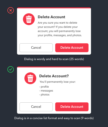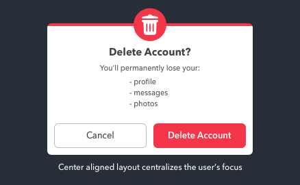 それだけでなく、確認後に何が起きるのかを長い文章で説明することは避けましょう。「アカウントを削除すると、自分のプロフィール、メッセージ、写真を永久に失うことになります」と通知する代わりに、失うものをリスト形式で項目分けして、すばやく読み取れるようにします。
