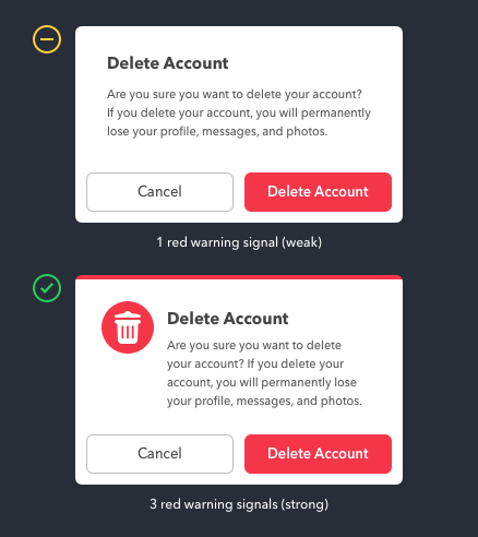 赤いボタンは、ほとんどのユーザーに警告を伝えますが、中には深刻に捉えないユーザーもいます。視覚的な合図を追加することにより、すべてのユーザーに対して、その警告をさらに強いものにすることができます。これは特に、色の違いが見えにくい色覚異常や視覚障害のあるユーザーに有効です。