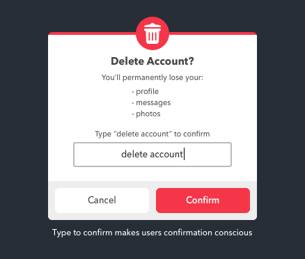 この手法は、ユーザーが頻繁に使用する破壊的アクションに対しては効率的ではありません。 たとえば、投稿を削除することはソーシャルメディアアプリで一般的なアクションです。 確認のために毎回ユーザーに入力を要求することは非効率的です。ごくまれな破壊的アクションに対してのみ、この手法を使用しましょう。