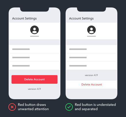破壊的アクションは、赤いテキストで表示された、独立したボタンにするのが良いでしょう。必要以上に赤を使用すると、ユーザーがその画面上の主要なCTAボタンと勘違いする可能性があります。