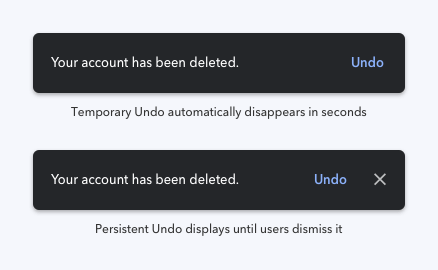 一時的な「元に戻す」は、ボタンを押した数秒後に自動的に消えます。「元に戻す」を固定する場合は、ユーザーが「閉じる」ボタンを押してバナーを閉じるまで表示されます。「元に戻す」を固定して実装することは、一時的な「元に戻す」よりも技術的に複雑であることに注意してください。