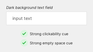 すべてのユーザーにとって明確な手がかりにするために、一次的な手がかりと二次的な手がかりを用意する必要があります。入力フィールドの視覚的な手がかりは、クリックのしやすさと空白から成ります。ただ、別のインターフェイスの要素では、視覚的な手がかりが異なることがあるでしょう。