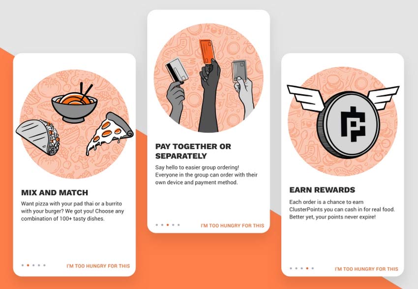 ClusterTruckのオンボーディングプロセスはまさにその最たる例です。各画面は2つの部分があり、コンテンツ、機能が解説されている部分、そして適切な視覚的合図でこのステートメントをサポートする図です。