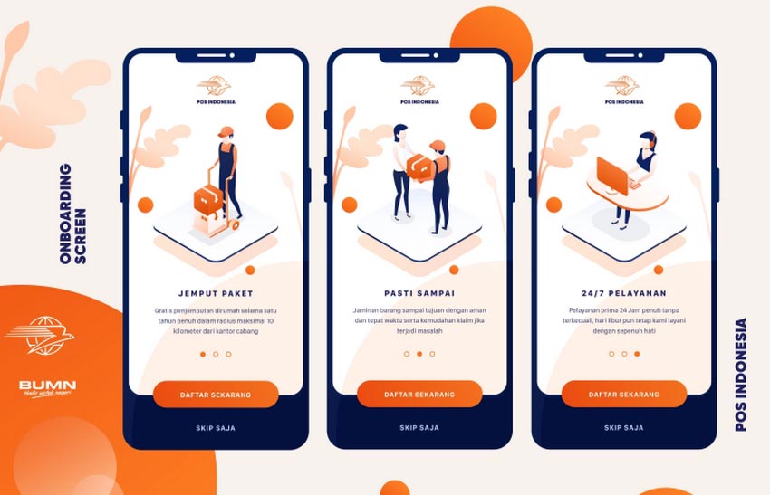 POS Indonesia(インドネシアの郵便サービス)のアプリのオンボーディングでは、発信しようとするメッセージを強調するのみならず、適切な雰囲気を確立する目的でイラストを使用しています。ここのベクター画像は企業のモットーを完璧に表現しているだけでなく、真摯でフォーマルなイメージを表現しています。