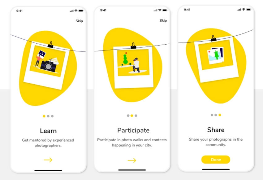 情報ボックスが完全な形でイラストされた画面と自然に調和していることに注目してください。これらは、スタンドアロンユニットであるだけでなく、写真に必要不可欠なエレメントです。オンボーディング全体は圧巻ともいえる、すばらしい作品になっています。