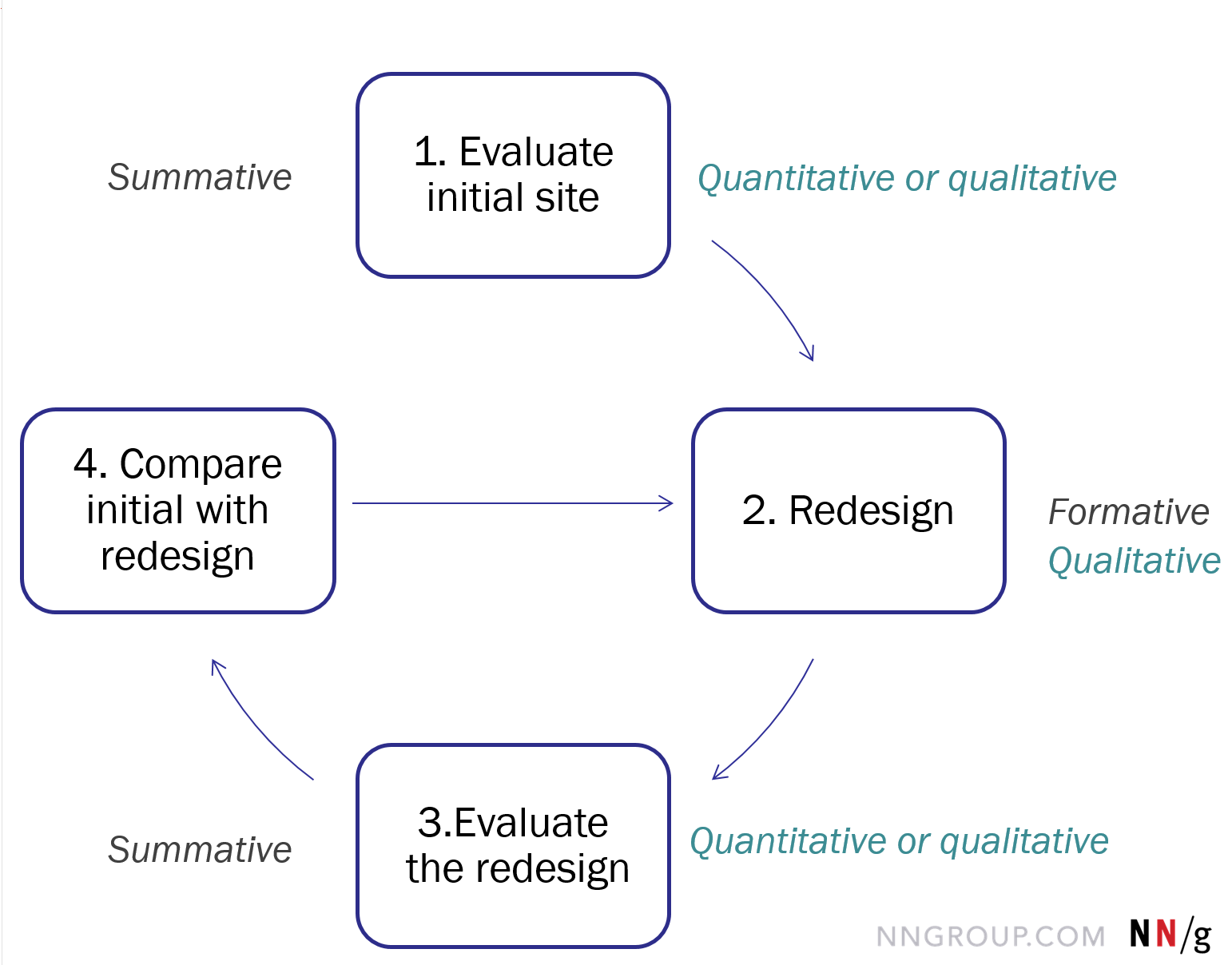 デザインの見直しのプロセスは既存のデザインを評価することから始まるため、上の図では最初のステップが総括的テストになっています。デザイン要素が評価され、データが集められたら、何がうまくいっていないのか、どこで多くのユーザーが苦労しているのかがわかります。そうしたら次のステップに進んで、プラットフォームに追加すべき新たなデザイン要素を知るために定性的テストを実施します。